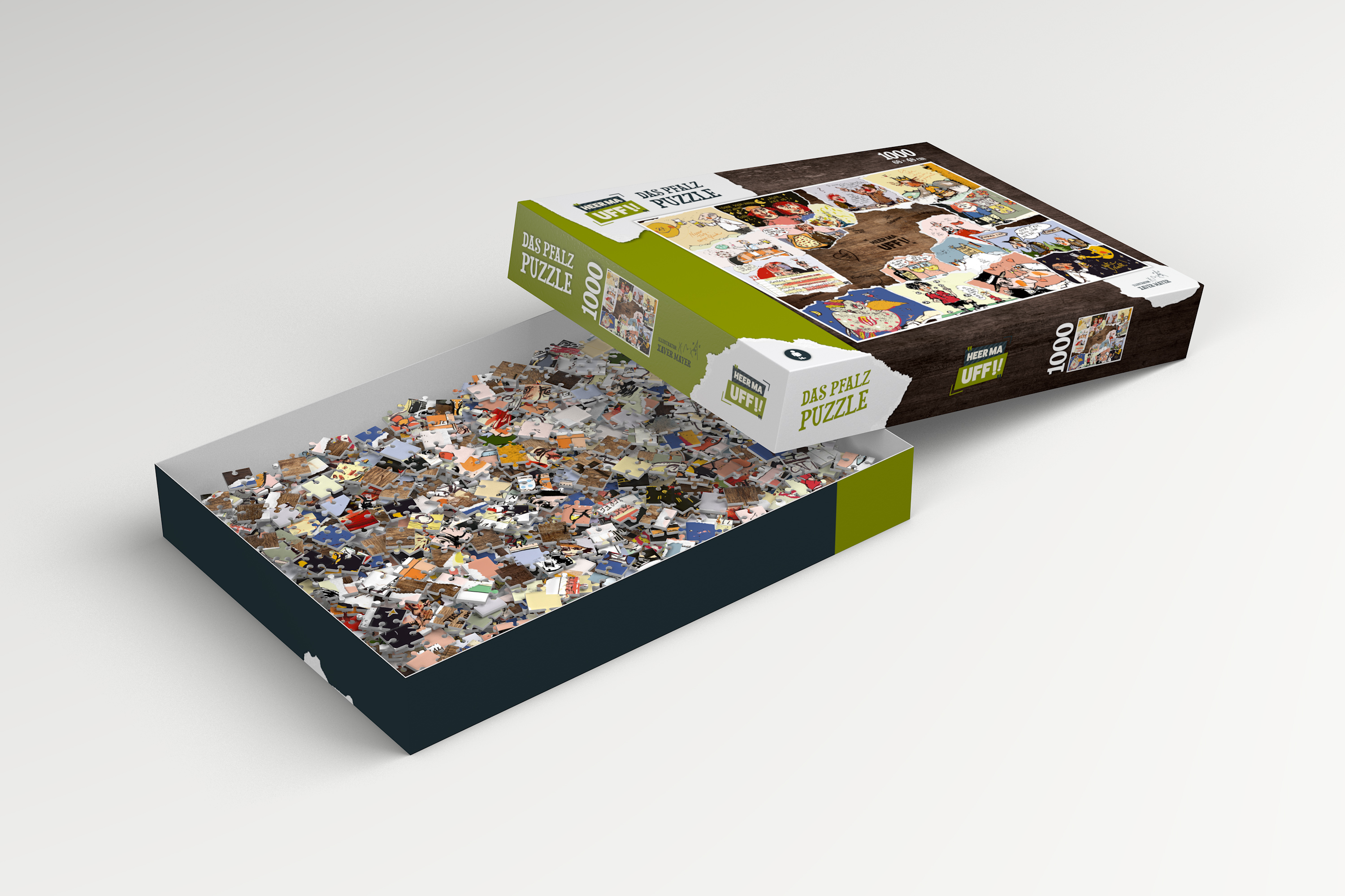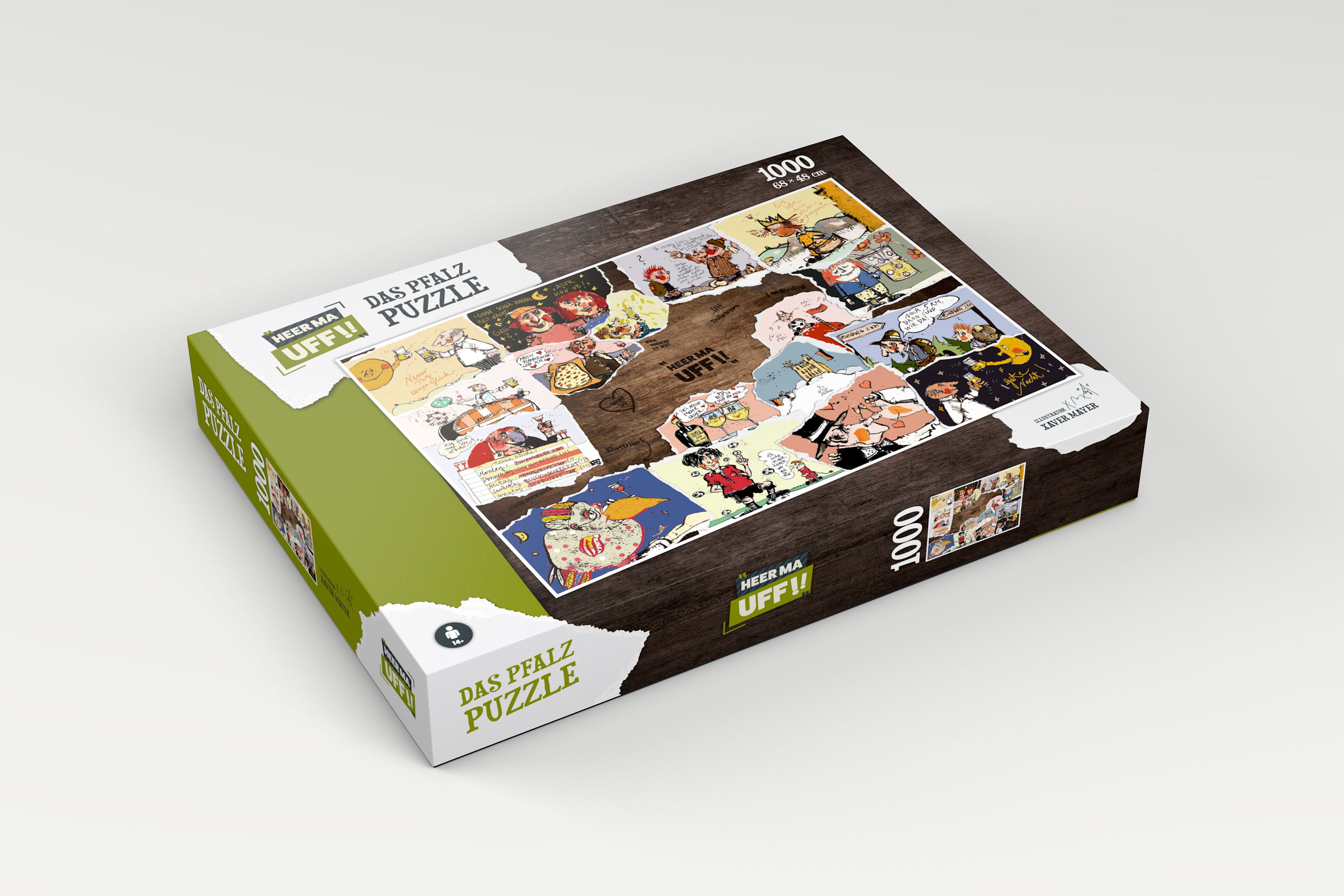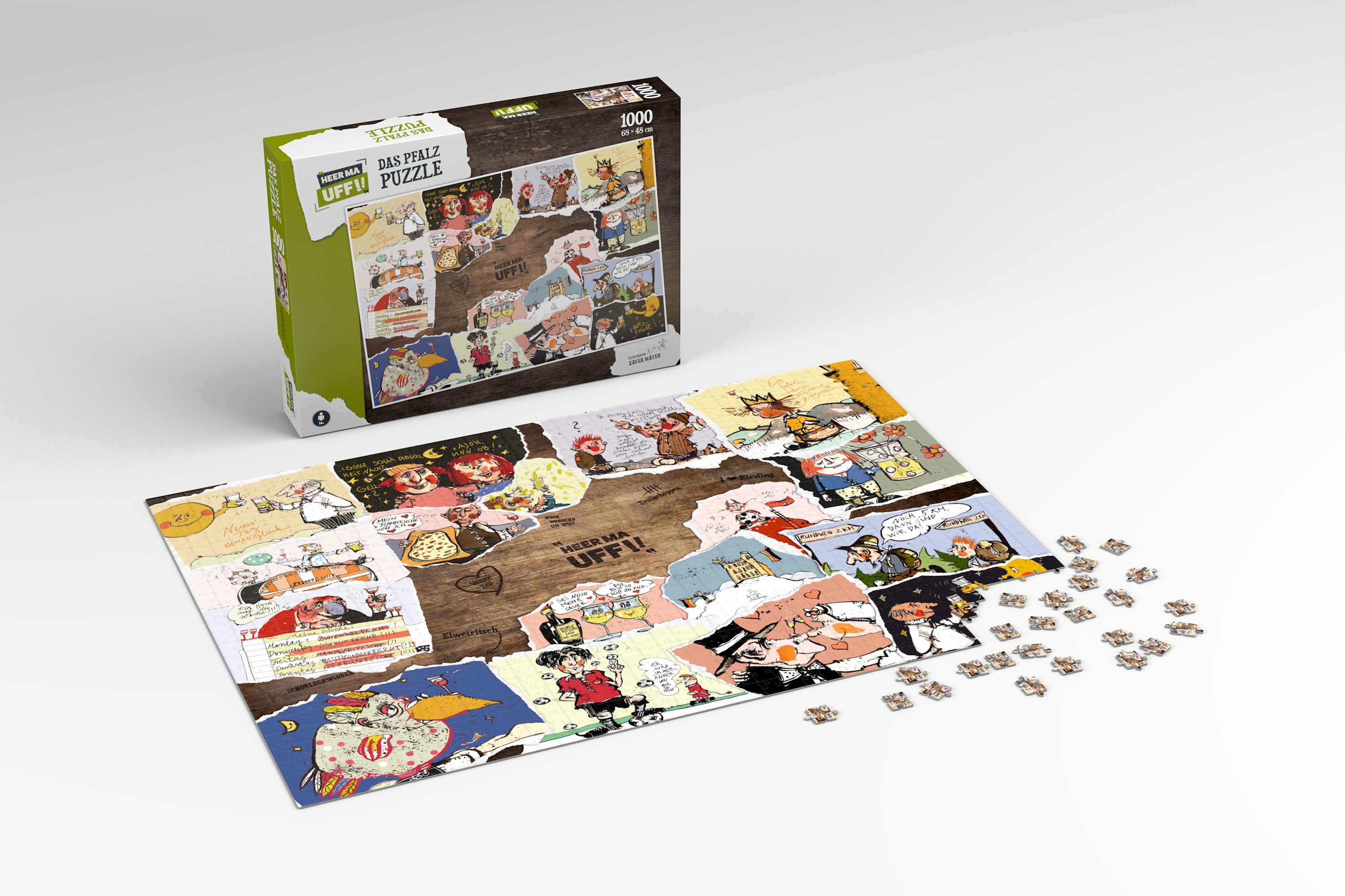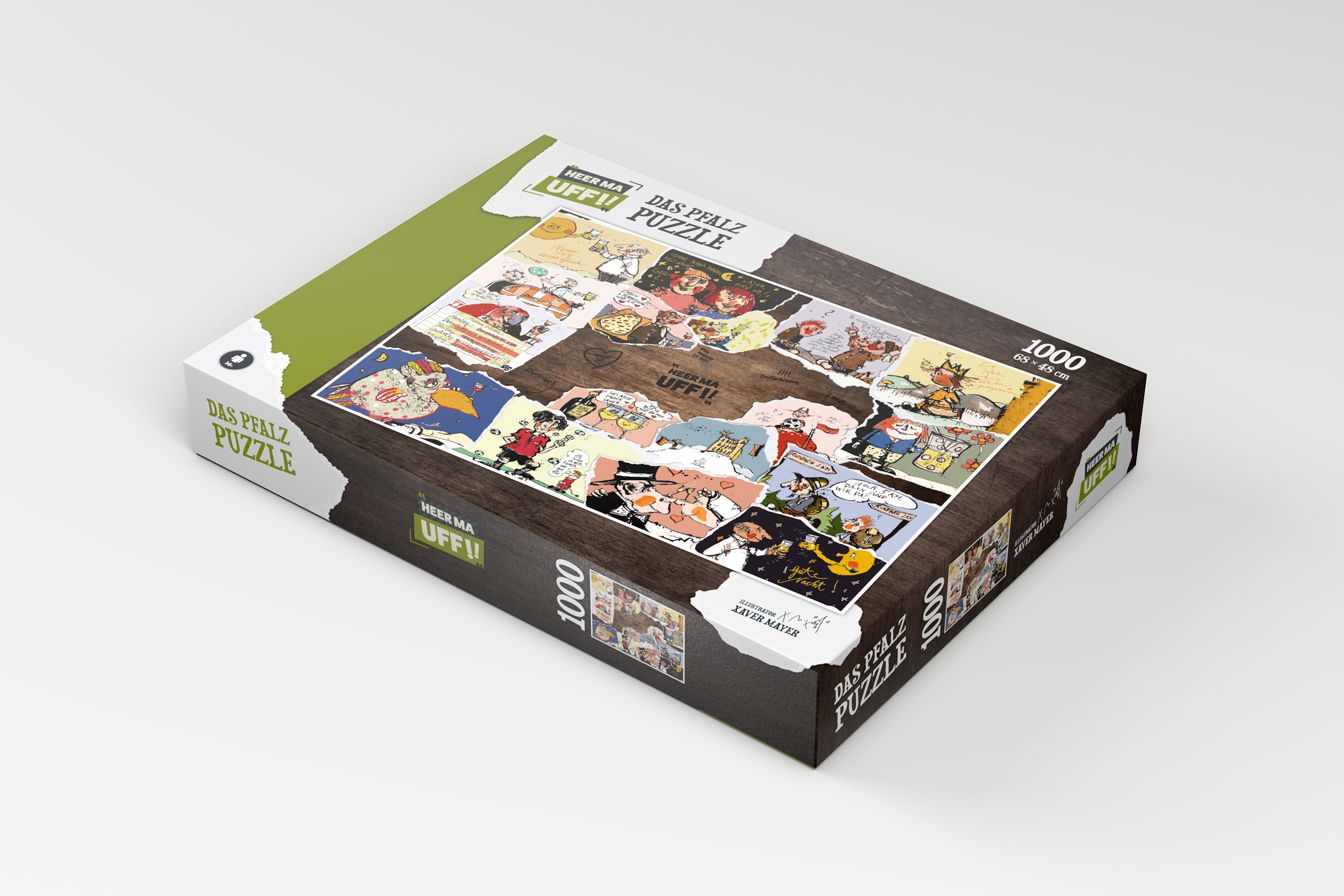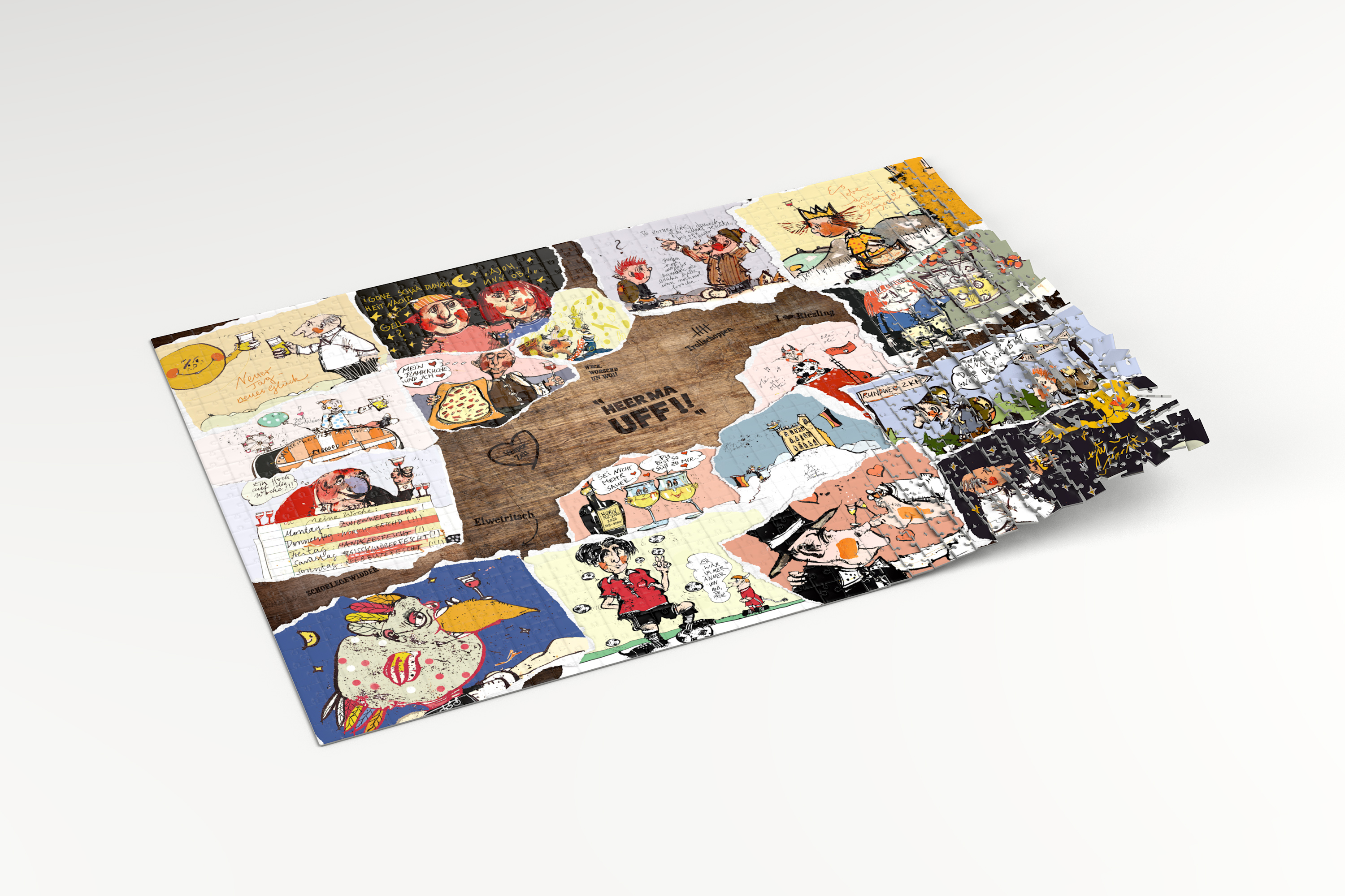 Büttenpapier zufrieden vor sich hinzutrocknen. Für das Spiel „Heer ma uff!!“ und dieses zugehörige Puzzle mit den witzigsten Motiven findet sich jedoch seine Kunst auf einem völlig neuen Medium wieder.